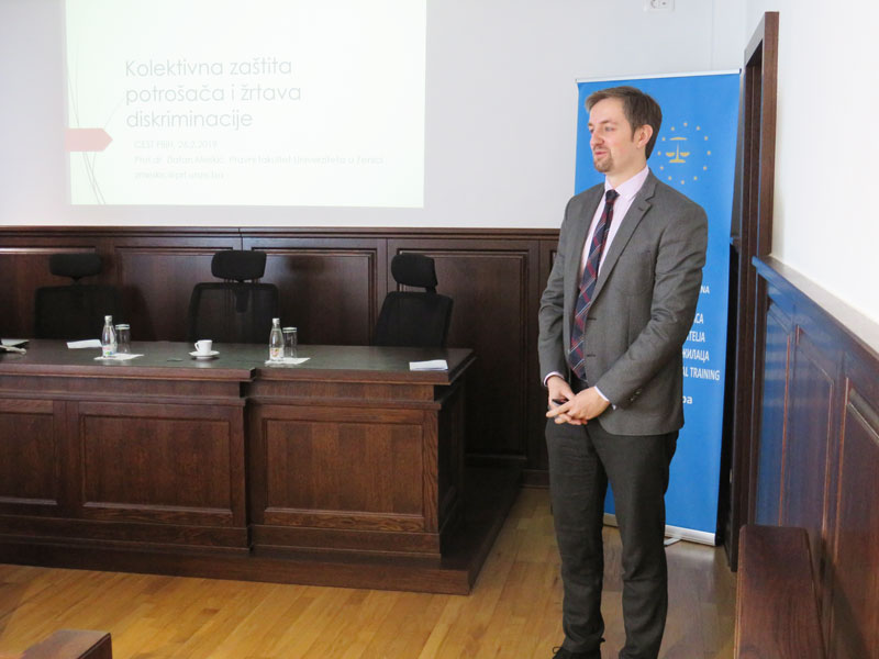 Edukator na seminaru je bio gosp. Prof. dr. Zlatan Meškić, vanredni profesor Pravnog fakulteta Univerziteta u Zenici, koji je govorio o koletivnoj zaštiti u oblasti zaštite potrošača (o novim razvojima u materijalnopravnoj zaštiti potrošača, te procesnim pogodnostima za potrošače u zakonodavstvu BiH i EU), i kolektivnoj zaštiti u oblasti zabrane diskriminacije (analizirao materijalnopravne odredbe o zabrani diskriminacije te procesnopravne aspekte zabrane diskriminacije).