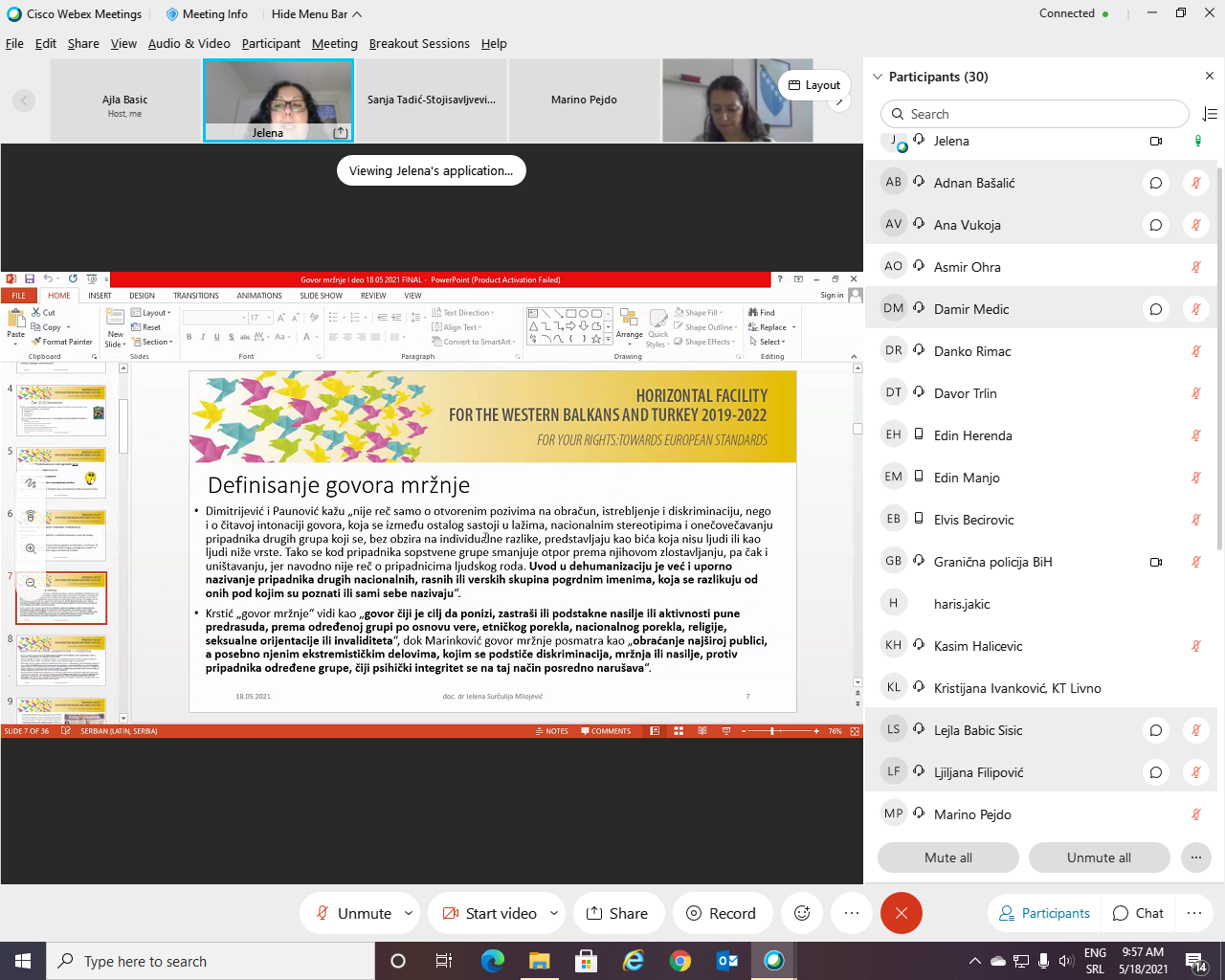 Centar za edukaciju sudija i tužilaca Federacije Bosne i Hercegovine je dana 17./18.-05.2021. godine u saradnji sa Vijećem Evrope održalo dvodnevnu edukaciju u okviru implementacije projekta JUFREX II u drugoj fazi na temu „Krivično pravni aspekti govora mržnja“, iz oblasti ljudskih prava i krivičnog prava. Ovom kaskadnom treningu prisustvovalo je 39 učesnika, sudija krivičnog referata, tužioca i policajaca iz Federacije Bosne i Hercegovine. Poštujući epidemiološke mjere zbog virusa Covid- 19, seminar je održan on line putem Cisco Webex platforme.
