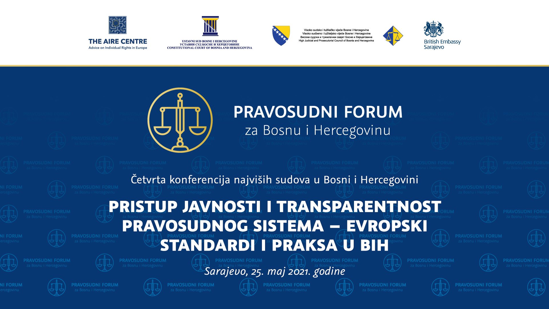 Ustavni sud Bosne i Hercegovine i AIRE centar Program za Zapadni Balkan, u saradnji sa Visokim sudskim i tužilačkim vijećem i uz podršku Britanske ambasade u Sarajevu, organizuju četvrtu godišnju konferenciju Pravosudnog foruma za Bosnu i Hercegovinu na temu: Pristup javnosti i transparentnost pravosudnog sistema – Evropski standardi i praksa u BiH. Konferenciju će biti moguće pratiti online putem Zoom platforme.