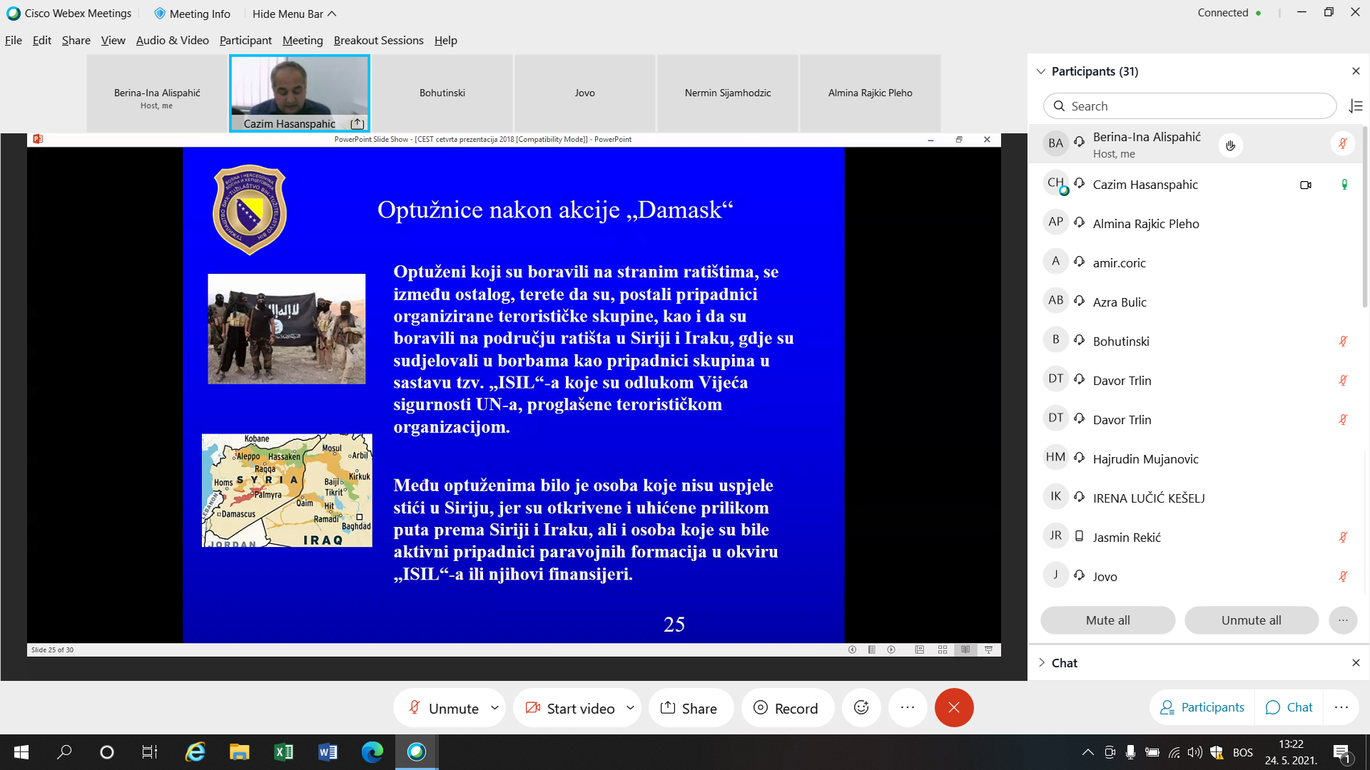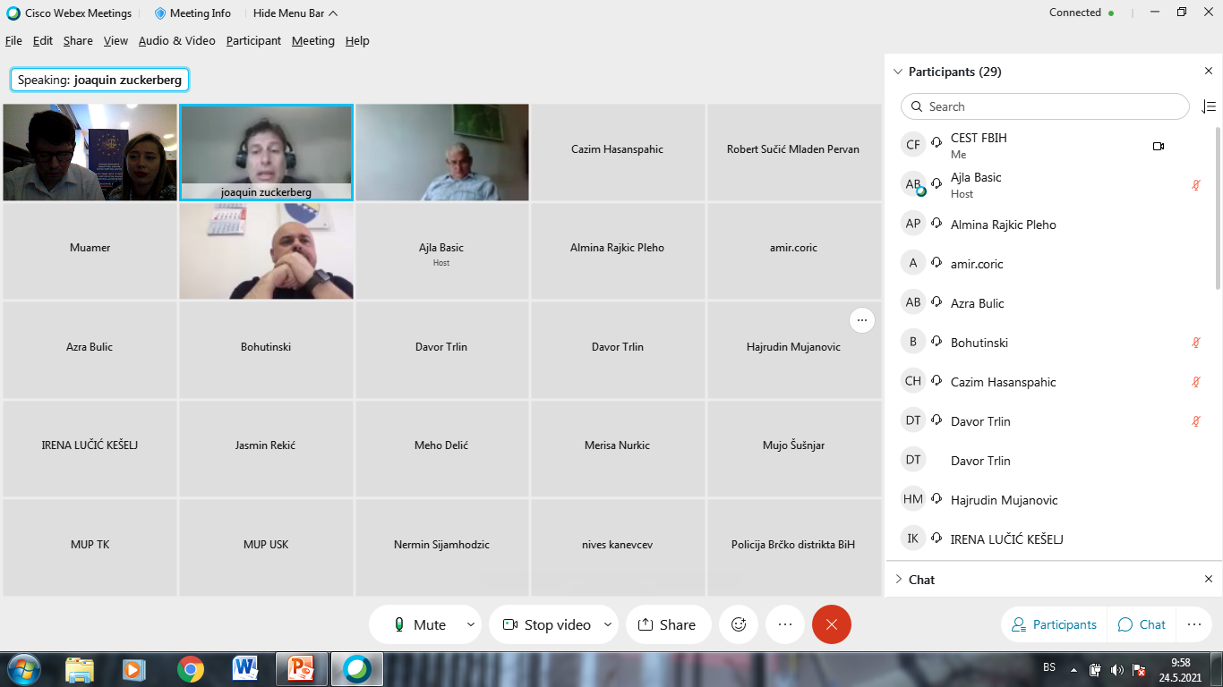 U skladu sa Programom početne obuke i programom stručnog usavršavanja Centra za edukaciju sudija i tužioca Federacije Bosne i Hercegovine za 2021. godinu , a u saradnji sa AIRE centrom, dana 24. i 25.05.2021. godine, realizovan je online seminar „Istrage i presuđivanje slučajeva koji uključuju strane terorističke borce u Jugoistočnoj Evropi“.