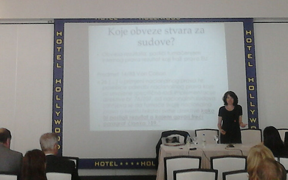Profesorica je učesnicima pripremila jedno uvodno predavanje o stukturi sudstva u EU, kako je organiziran i kako funkcionira Sud EU i u kakvom je odnosu sa sudovima državama članica. Nakon toga je održala predavanje o intepretativnom učinku prava EU, koje je uključivalo i studiju slučaja (predmet “Dominguez” C-282/10).