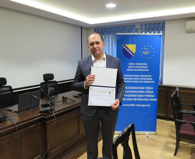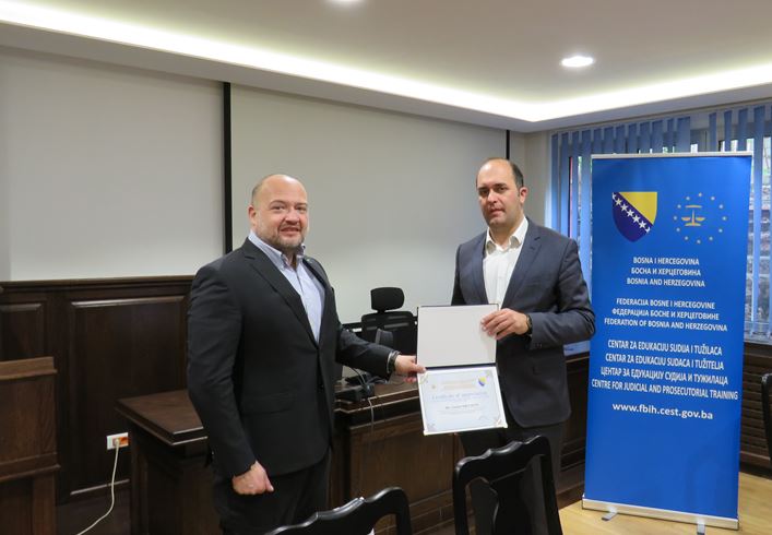 Direktor Centra za edukaciju sudija i tužilaca u Federaciji BiH dr.sc. Arben Murtezić uručio je zahvalnicu Goranu Krnaichu, rezidentnom pravnom savjetniku Programa za razvoj, pomoć i obuku u prekomorskim zemljama Ministarstva pravosuđa SAD-a (OPDAT) za dugogodišnju uspješnu saradnju i nesebičnu podršku uz želju za uspjeh u budućim poslovnim aktivnostima koje gospodin Krnaich nastavlja u Sjedinjenim Američkim Državama.